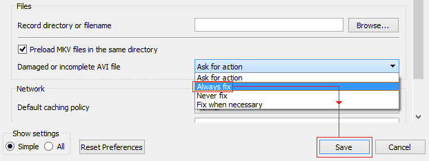 - Select Always Fix next to “Damaged or Incomplete AVI file”.