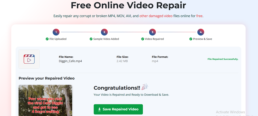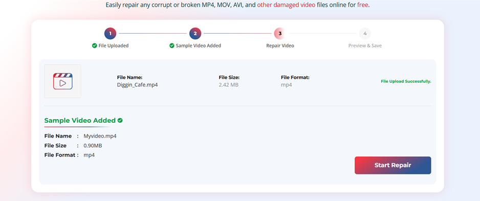 Step 2: Once uploaded, click Start Repair to let this online video repair software analyse the file for corruption issues. Wait till the software runs its algorithms to fix headers, indexes, frame data, and other structural issues.